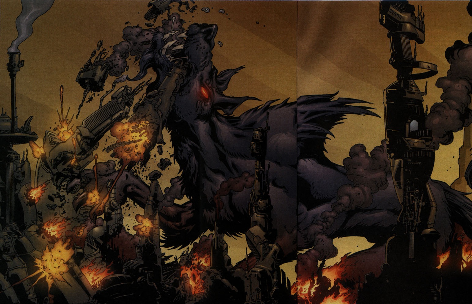 | Fenrir (Terra-2301) é espancado até a morte por Hulk após querer arrancar um pedaço da lua. [Fonte] |